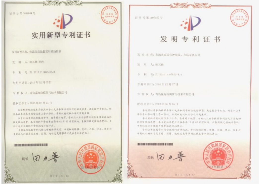Utility model patent, <current anti-corrosion device auxiliary anode>, ZL 2013 2 0065 408.8. Mainly solved the material of electrode base material with strong oxide acid of seawater MMO mixed metal oxide anode, and modeling seal technology, the total life span of electrode has been doubled.